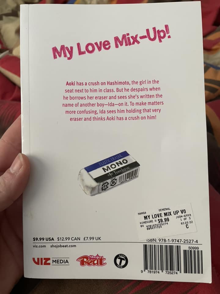 Aoki has a crush on Hashimoto, the girl in the seat next to him in class. But he despairs when he borrows her eraser and sees she’s written the name of another boy—Ida—on it. To make matters more confusing, Ida sees Aoki holding that very eraser and thinks Aoki has a crush on him.”