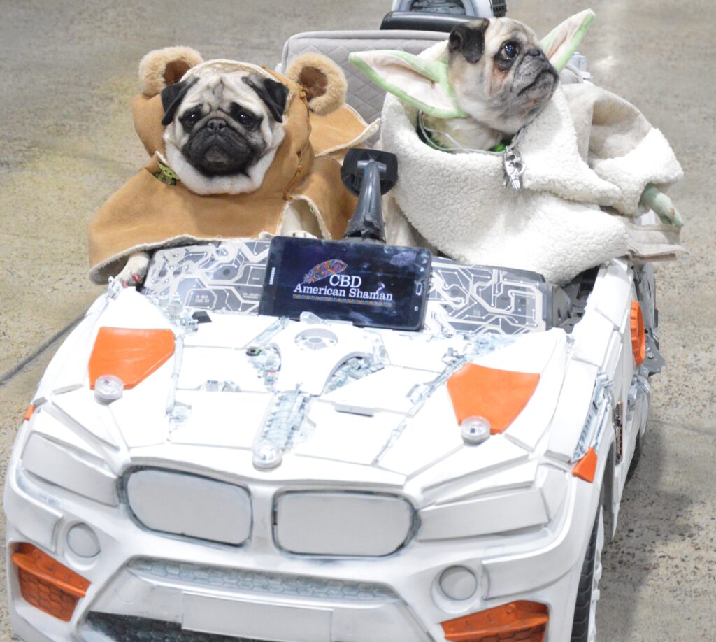 Pug Yoda and a Pug Ewok driving a Star Wars Car